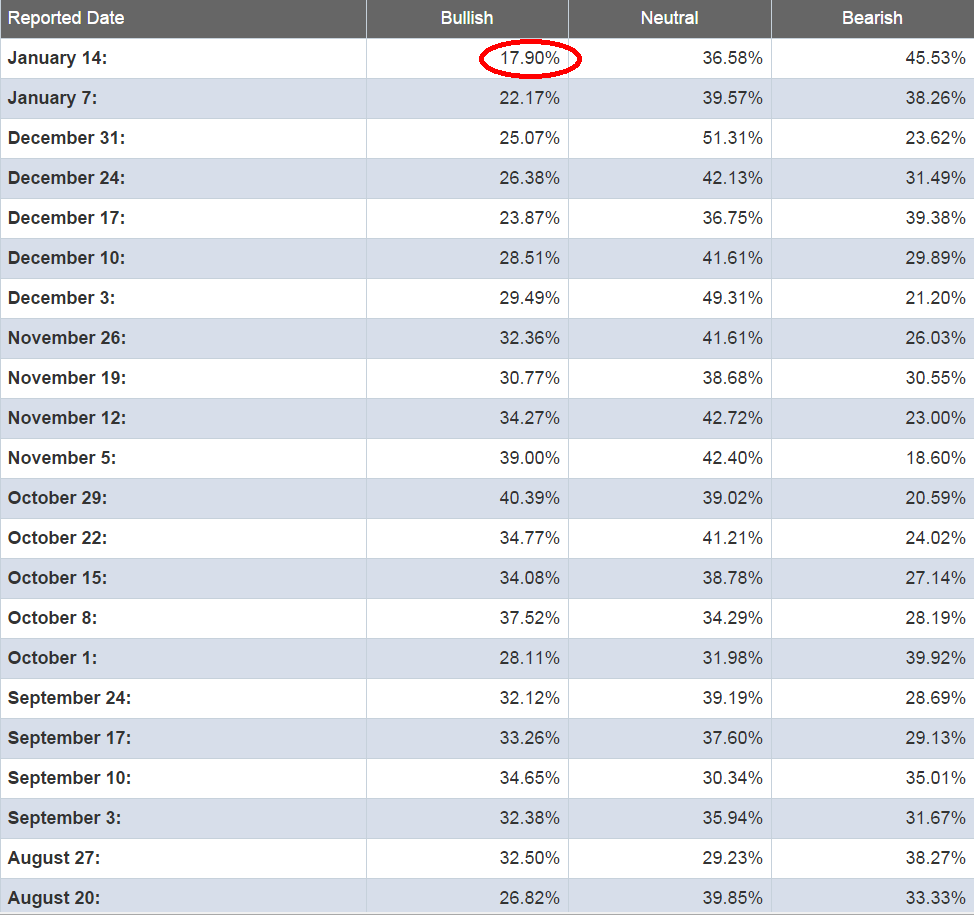 A heti kisbefektetői felmérés még ennél is durvább eltántorodást jelez: utoljára 2005-ben, tehát 11 éve volt ilyen alacsony az optimisták aránya. Az is igaz közben, hogy a pesszimisták tábora egyelőre még nem duzzadt ilyen történelmi szintekre. Lehet, hogy még egy széles körű eladási hullám kell ehhez? Ki tudja?